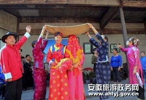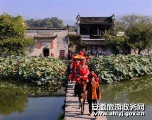 2、宏村婚嫁表演吸引遊客流連。宏村景區以古鎮特色民俗旅遊資源為基礎,打造宏村傳統婚嫁習俗文化旅遊精品活動,強力推出“迎中秋,慶十一,宏村民俗花轎遊”活動。連日來,宏村南湖邊,傳統的婚嫁迎親隊伍身著傳統服飾,在嗩呐、鑼鼓的伴奏下,正沿著南湖岸邊緩緩前進,“看,那邊有人結婚”在熙攘的人群中突然尖叫了一句,引得遊客紛紛駐足觀看,合影留念。一位年輕的女遊客輕輕的對著同伴說“我將來要是能到宏村舉辦這樣一場傳統婚禮多好呀!”.